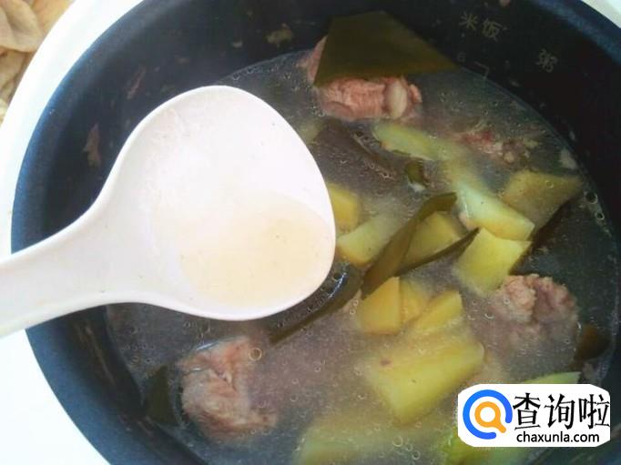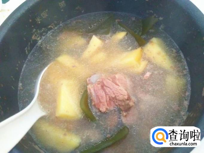 大概十五分钟后,土豆也熟了,加上一些食盐和一点点味素调味,盖上盖子继续煲二分钟。