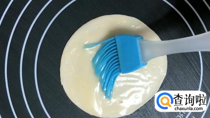 将准备好的饺子皮取出放在面板上,铺平后用小刷子在饺子皮上刷一层油。