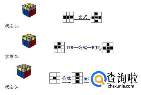 如果你的魔方顶面已经是这样了,那这一步就可以直接跳过,不过不是每次都会这样幸运的,公式还是需要背的。下面就是顶层三种状态和拧法。