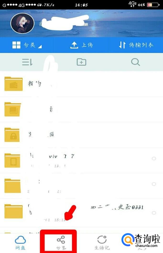 首先我们先登陆百度网盘,找到右下角的分享,点击进入,如图所示。