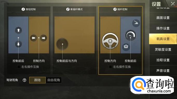 我们在设置中找到载具设置,它有三种开车方式,我们选择第三种带有手刹的开车方式。
