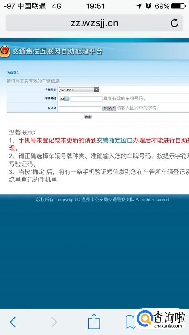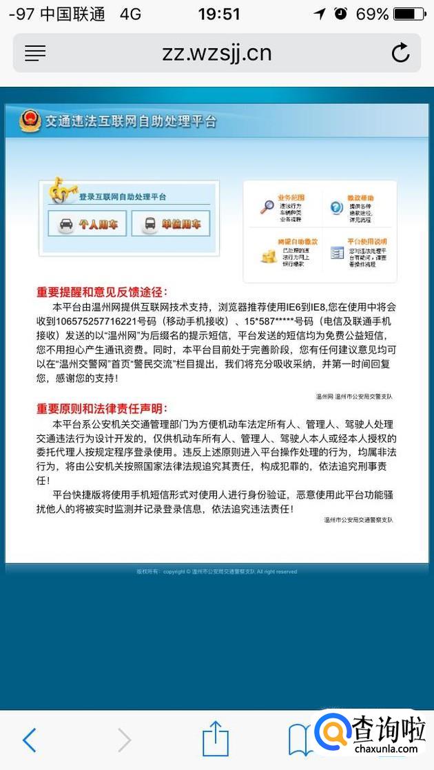 一般我们都是个人用车,点进去后,按照表格输入自己的车辆信息,然后登录进去,如图是我们登陆进去的图片,输入自己的违章信息进行查询。