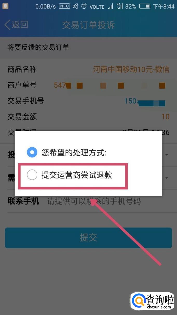 然后选择“需求说明”,也就是你希望的处理方式,选择“提交运营商尝试退款”,如图所示。