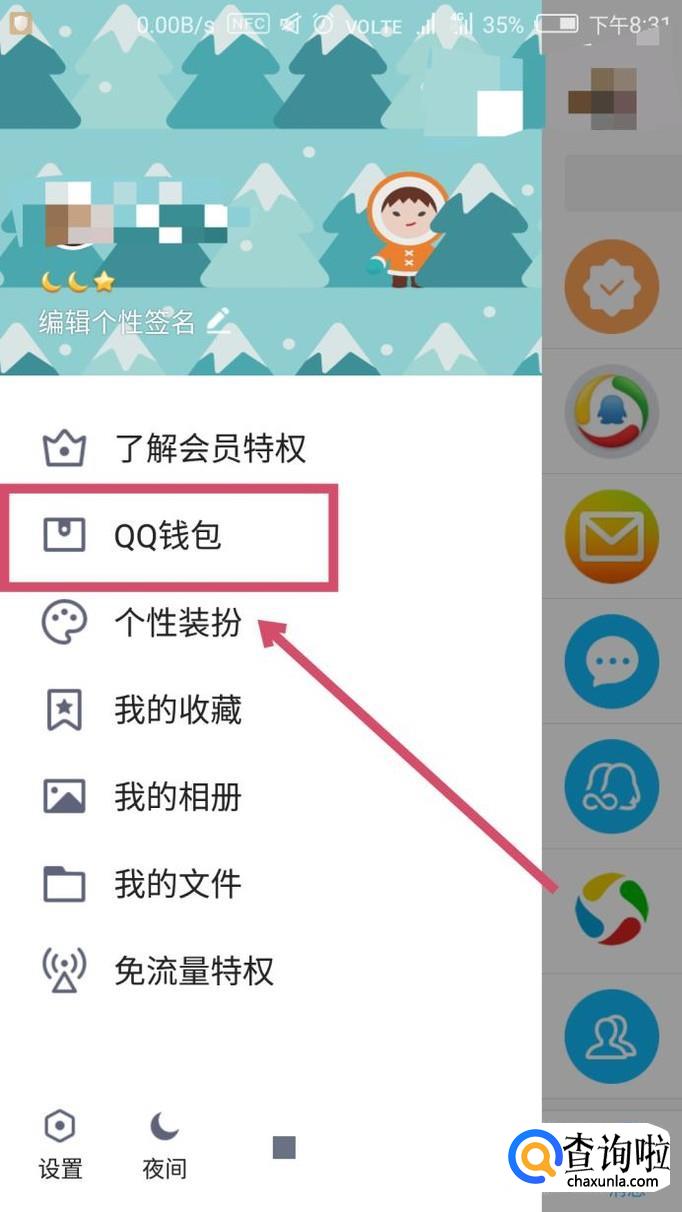 然后在左侧弹出的选项卡中找到“QQ钱包”,点击进入。