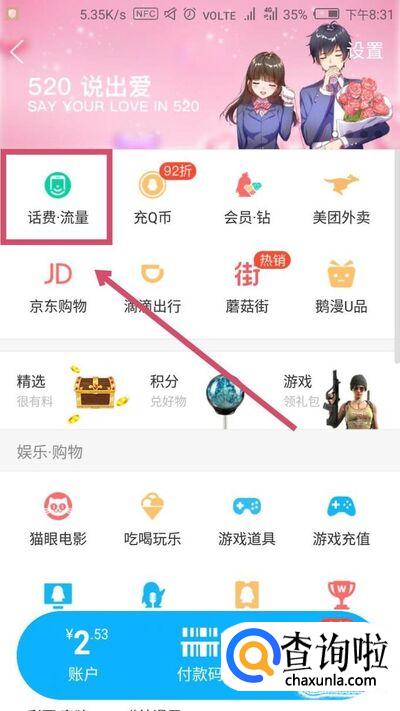 进入到“QQ钱包”后,在界面左上角可以找到“话费流量”,点击进入。