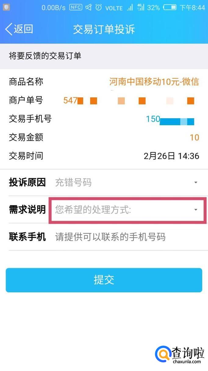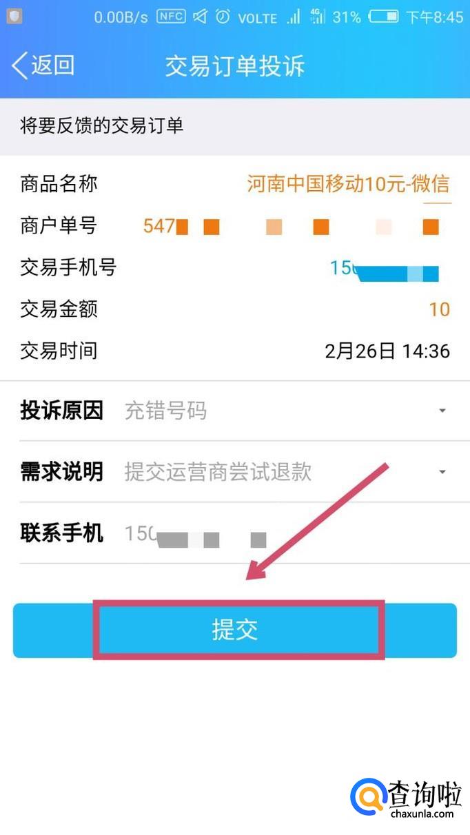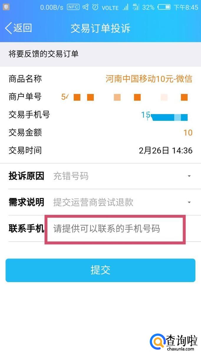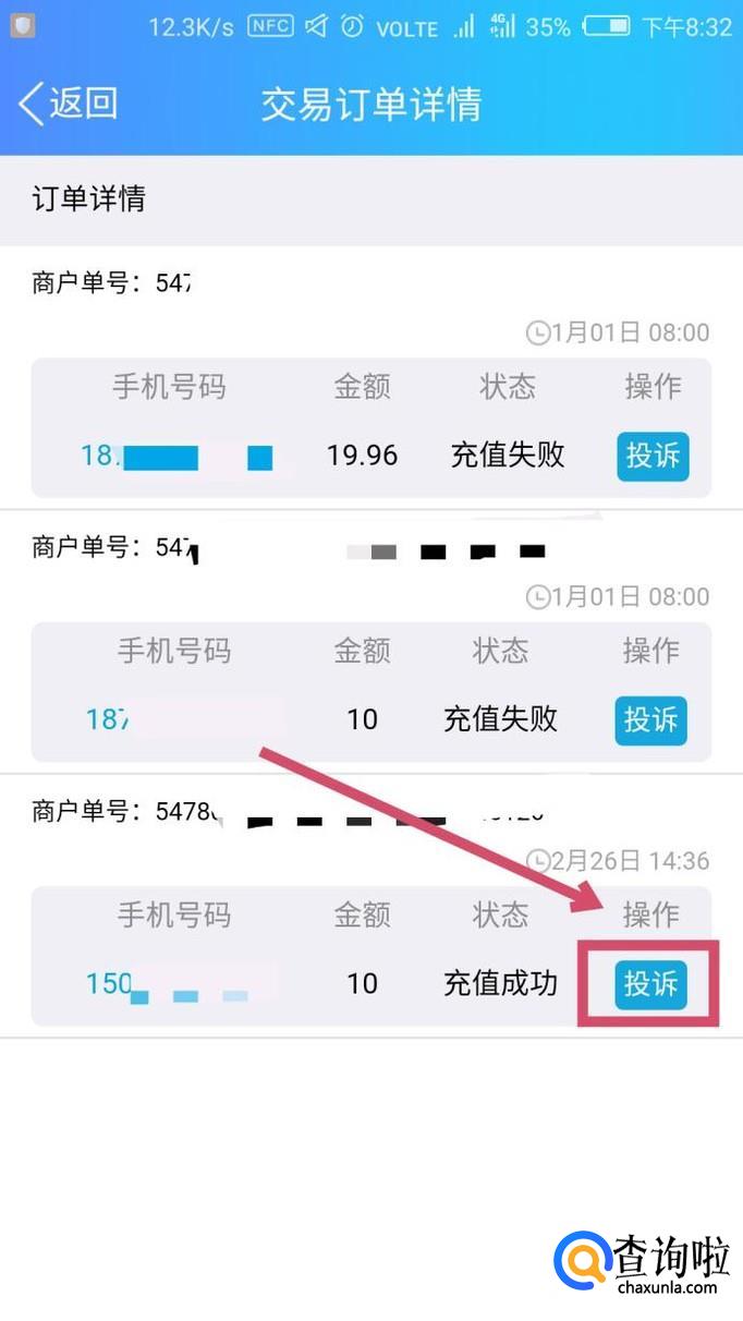 这里我们可以查询曾经的交易记录,找到冲错号码的那个订单,点击右侧的“投诉”,点击进入。