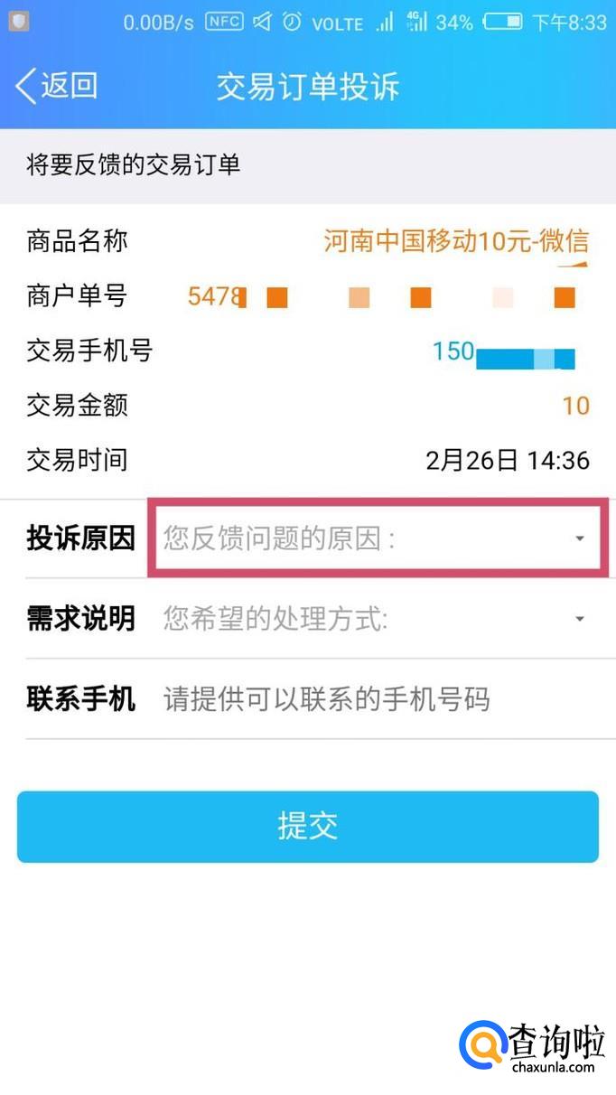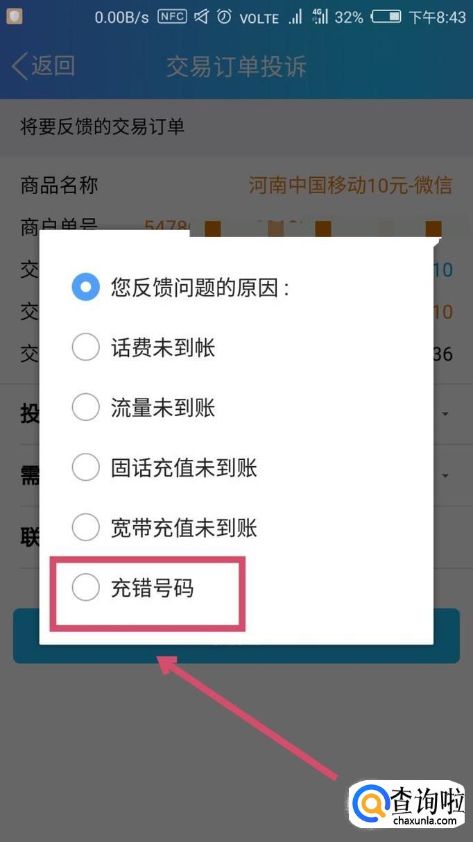 进入到“投诉”的界面,首先点击“投诉原因”,选择“充错号码”,如图所示。