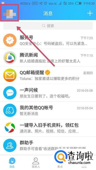 打开QQ,在主界面左上角找到你自己的头像,点击进入。