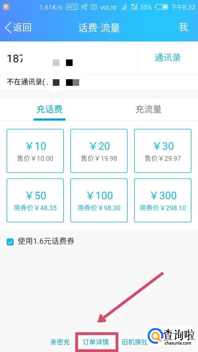 进入到充值界面后,在界面下方中央找到“订单详情”,点击进入。
