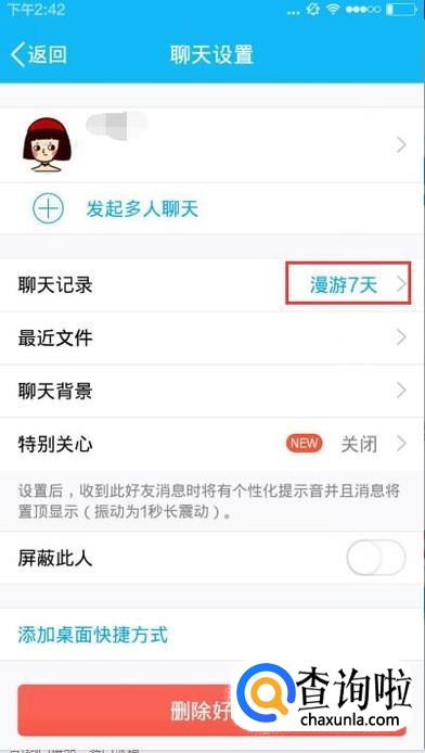 点击聊天记录中的漫游七天。