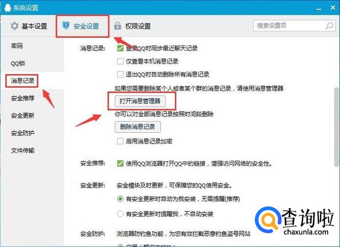 找到安全设置中消息记录的打开消息管理器。