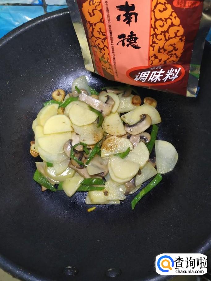 口蘑适量,土豆适量,青椒适量,蒜适量,盐适量,鸡精适量,五香粉适量,生抽适量陈醋适量。