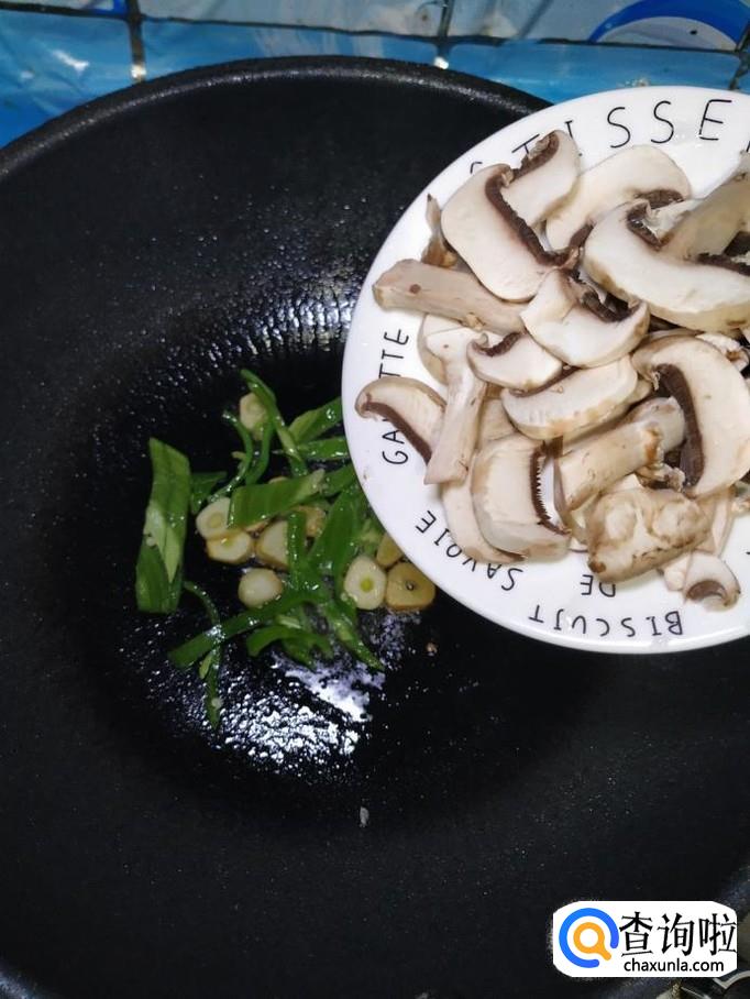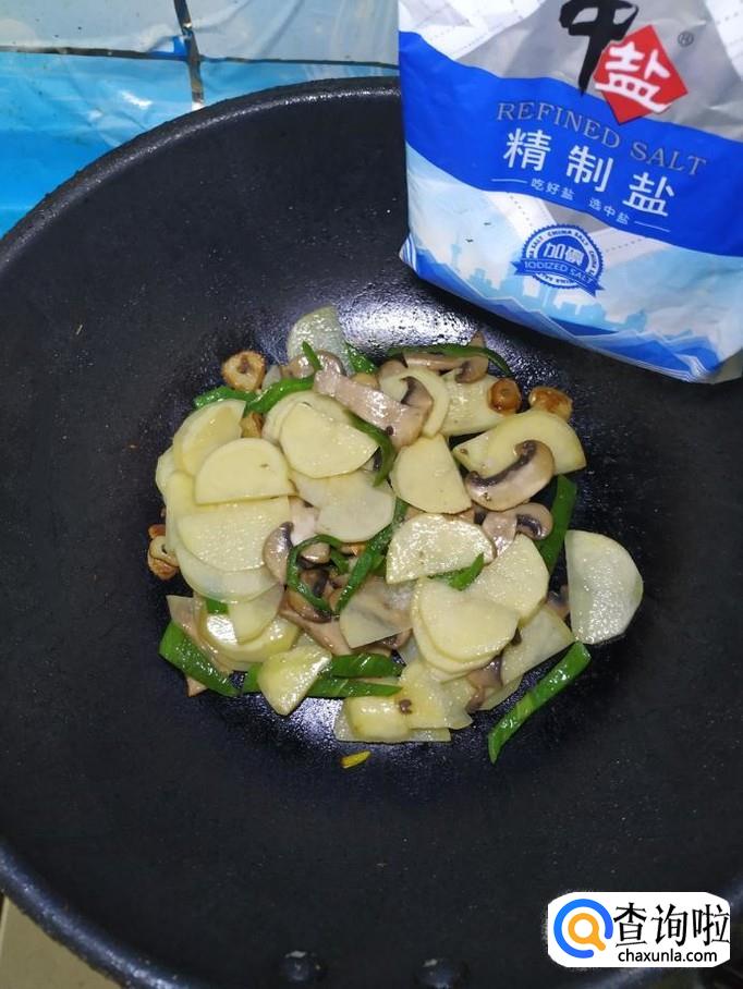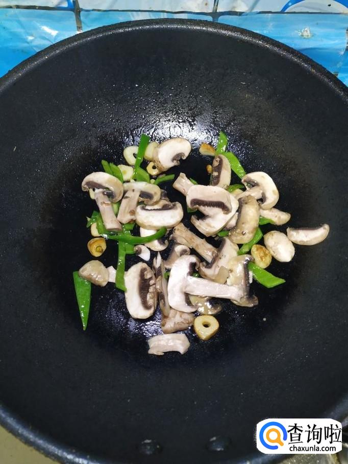 将切好的口蘑倒入锅中,和青椒丝一起翻炒均匀。