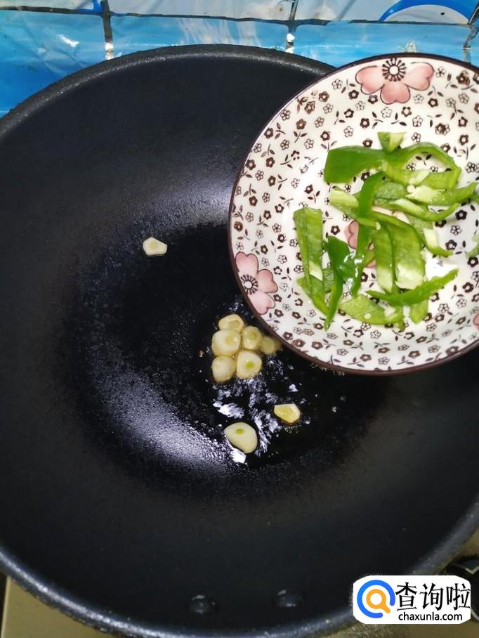 准备适量大蒜,去除外衣,切片备用,炒锅中放入适量油,油热后,放入蒜片爆香,然后将青椒丝倒入锅中,翻炒均匀。