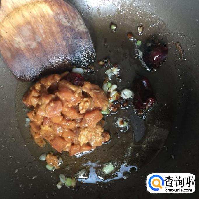 然后把瘦肉切成丁并用适量的酱油和地瓜粉裹一下,倒入锅中翻炒四分钟。