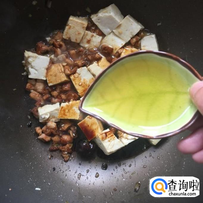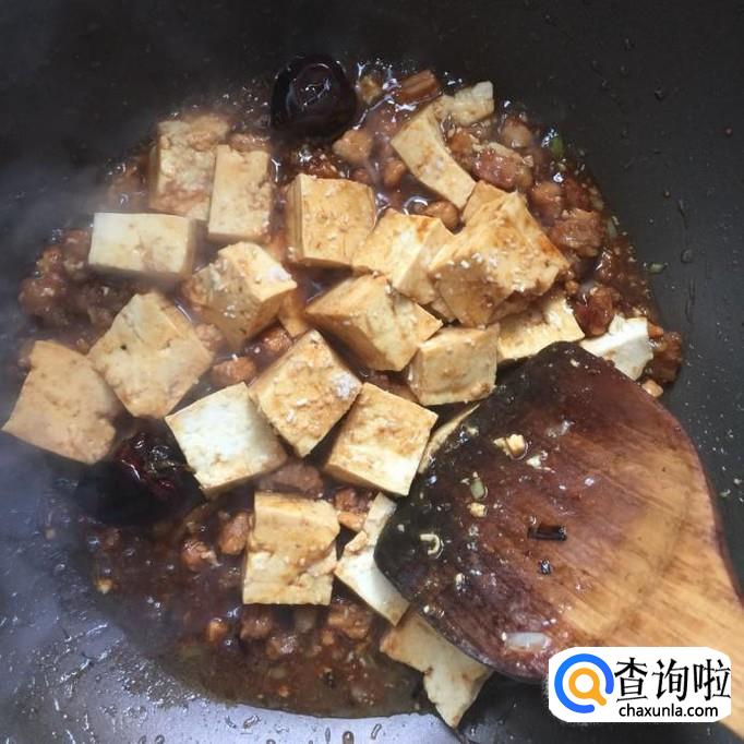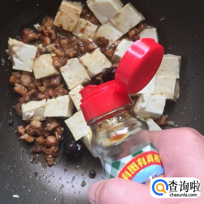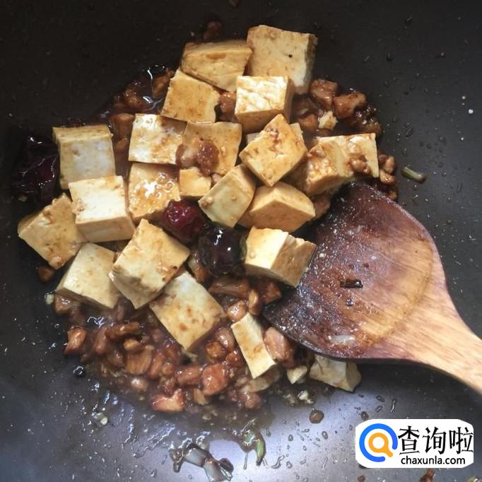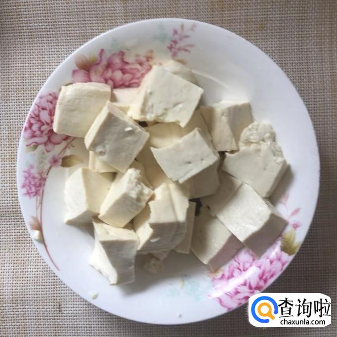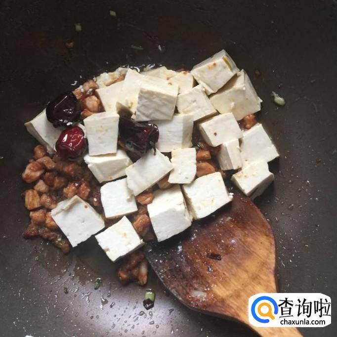接着把豆腐切成小块,倒入锅中和瘦肉丁一起翻炒三分钟。