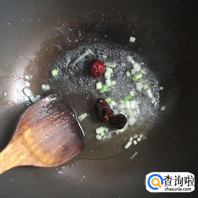 然后把香葱的叶子洒进锅中,翻炒片刻就可以出锅了。