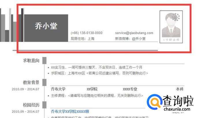 个人信息介绍是简历的第一部分,是必不可少的部分。这一部分我们要写清楚自己的姓名、电话、邮箱等。