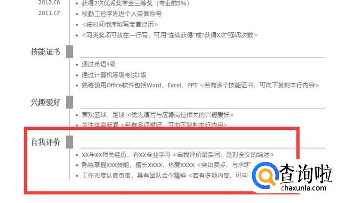 第四部分是自我评价部分。这一部分也是不能少的。主要写自己对自己的评价,以及一些看法。