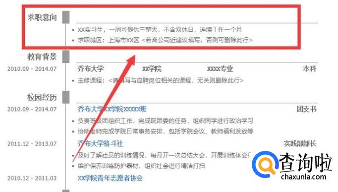 求职意向是简历的第二部分。同样这一部分也是必不可少的。在这一部分,我们要写清楚自己对工作的要求,例如工作地点,工作时间、薪资等。