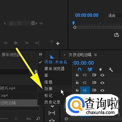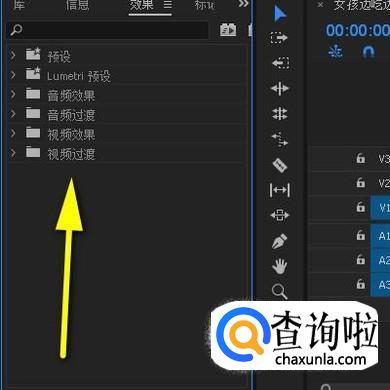 在左侧的项目面板中调出效果面板;效果面板中有音频效果,音频过渡、视频效果、视频过渡。鼠标点开“视频过渡”文件夹。