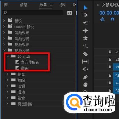 接着,下面即展示了7类转场特效。每一类都是一个文件夹;鼠标点击一下,展开相应的特效。比如,鼠标点击“3D运动”;下面即展开2项转场特效。