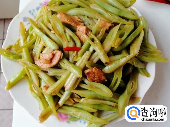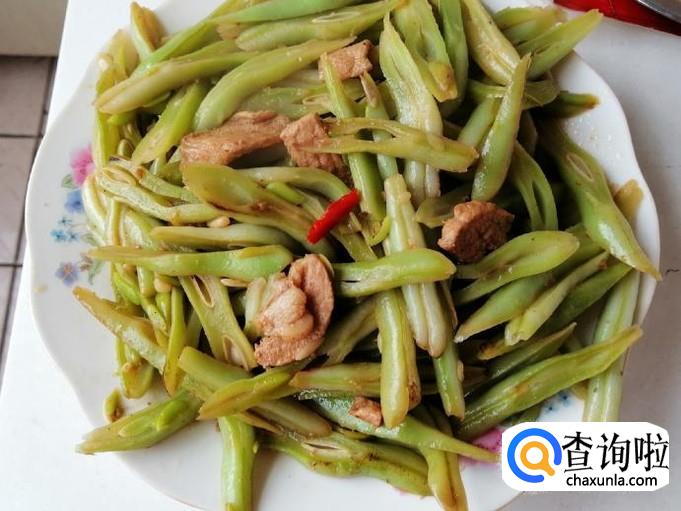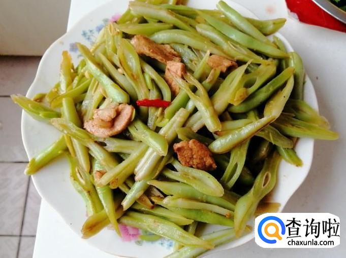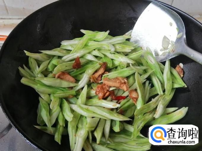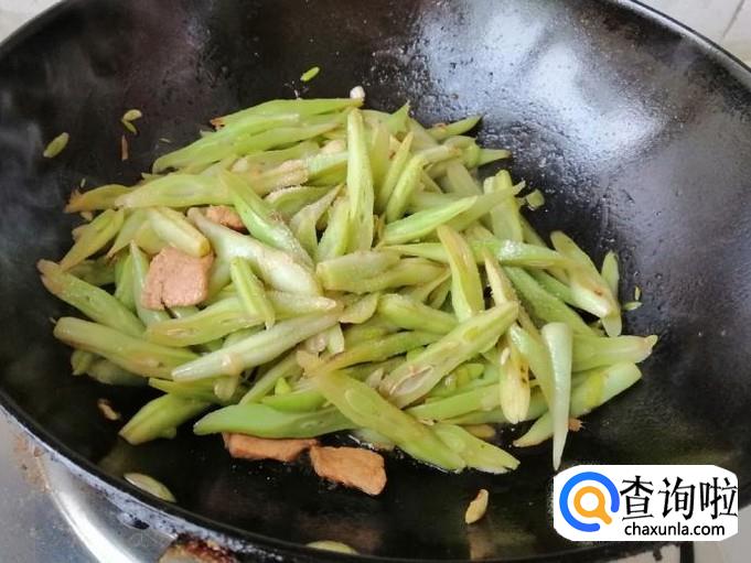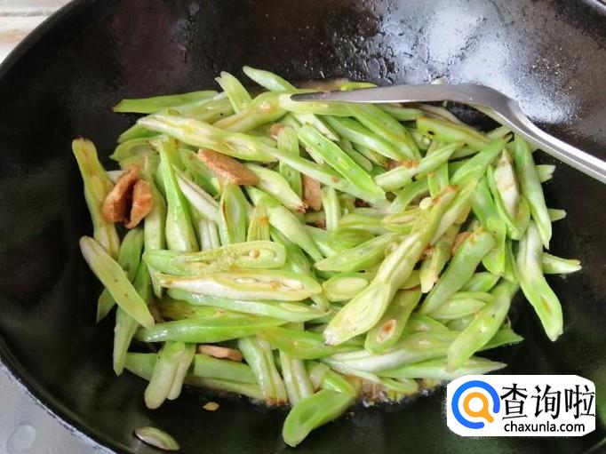 把放进油锅的芸豆丝翻炒均匀,翻炒片刻后就可以加入我们备好的熟猪肉,继续翻炒,让芸豆丝和肉均匀受热。