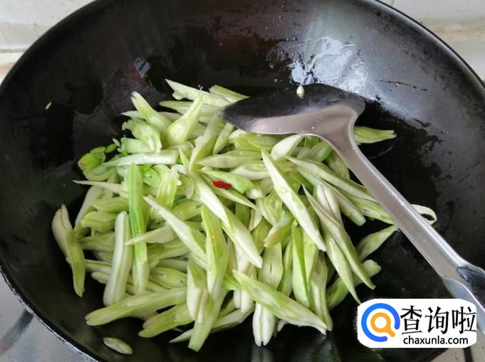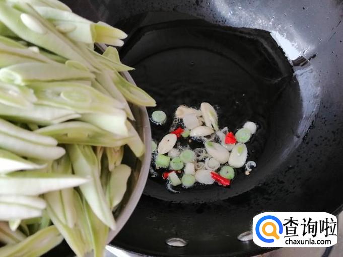 都准备好后点火,炒锅放油,油热后放入要爆锅的调味品,炒出香味就可以放入切好的芸豆丝,注意油温不能太高,太高的话芸豆丝容易炒糊。