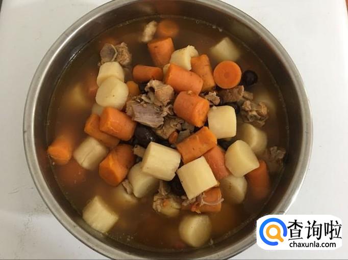 煮至排骨肉软,胡萝卜和山药软烂为止。加入适量盐后起锅。