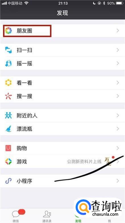 首先点击微信中的朋友圈,如下图所示。