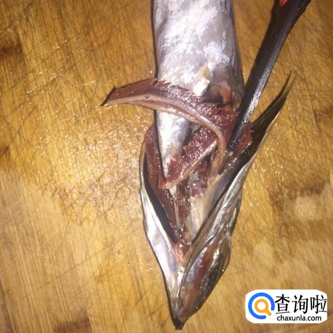 接着把带鱼的内脏抽出来就可以了。内脏你可以直接丢弃或者是煮熟了给猫狗吃也是可以的。