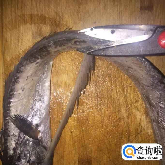 然后用剪刀在带鱼腮边中间三角区域直接剪到尾部就可以了。这里需要注意的是入刀不要太深,因为这样很容易把带鱼内脏弄破。