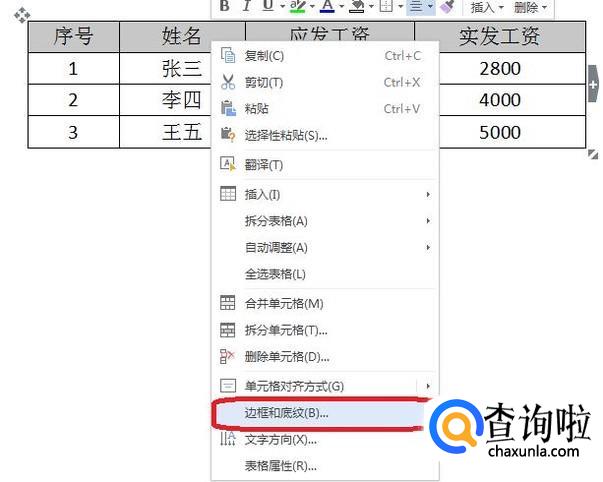 用鼠标全选第一行,如图所示,点击右键,弹出菜单中选择“边框与底纹”。