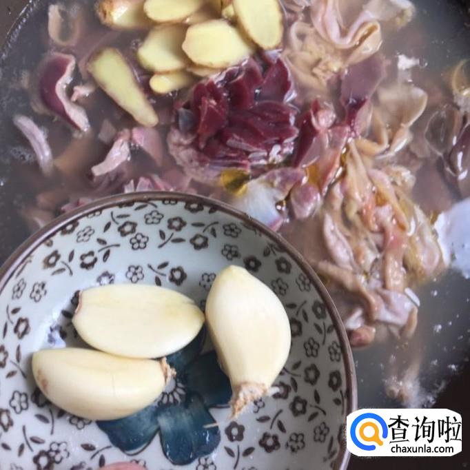 接着把生姜洗干净切成薄片,蒜头剥去外壳,倒入锅中,如下图所示。小贴士:卤制鸡杂的过程中加入生姜片和蒜头能够很好地去除鸡杂中的腥味。