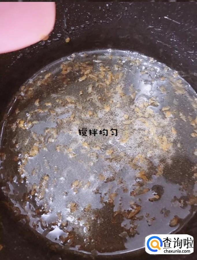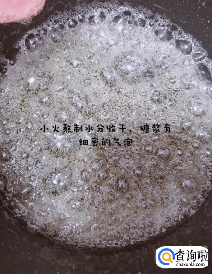 接着开小火熬至水分收干,糖浆中有细密的气泡出现,如下图所示。