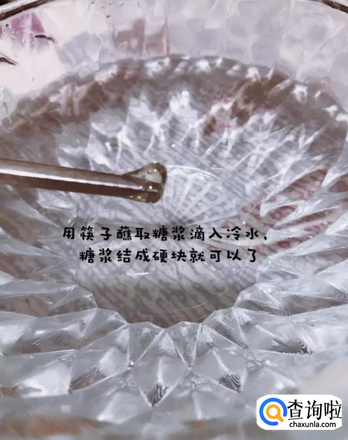 然后拿出一支筷子,沾上糖浆滴入冷水中,如果糖浆会结成硬块就可以了。