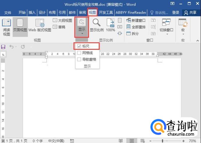 首先我们将标尺调出来,进入【视图】-【显示】,在这里会看到标尺,在标尺前面打钩即可显示出隐藏的标尺,反之是将标尺隐藏起来。