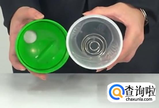 首先打开摇摇杯杯盖。这个弹簧状的物体是不锈钢搅拌器,它的作用是快速搅拌,电绝缘性能好,食品级无毒,并且化学性能好,与大多数化学药品都不反应。