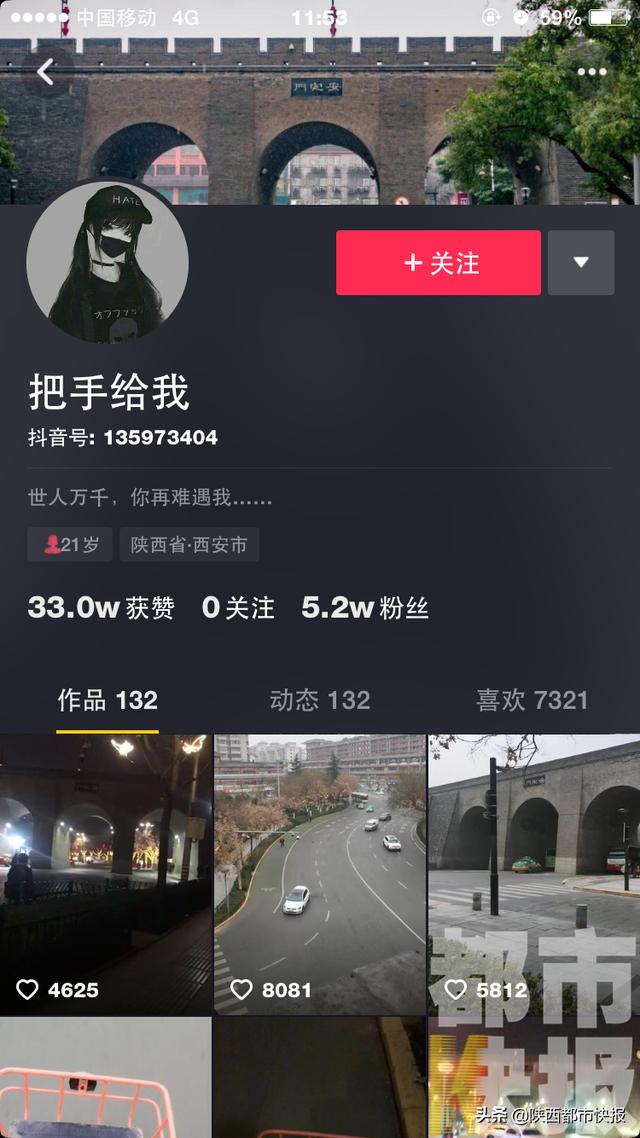 她的视频大多集中在早晚,都是在安定门外边骑自行车边拍摄的,并配有语音“安定门,了解一下”。从视频中看来,她偶尔也会经过长乐门的区域。除了打卡安定门,视频中偶尔也有“人生很苦但你却很甜”等土味情话的出现。据资料显示,这位昵称为“把手给我”的网友为女性,21岁,位于西安市,她的介绍中写着“世人万千,你再难遇我……”