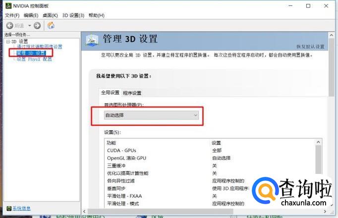 打开NVIDIA控制面板页面之后,点击页面左侧“管理3D设置”,然后找到页面右侧全局设置项。