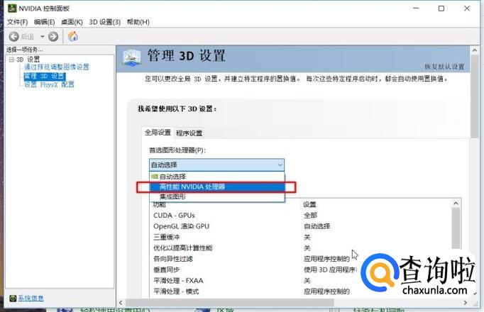 接下来,点击下拉菜单,将首选图形处理器切换为“高性能NVIDIA处理器”选项。