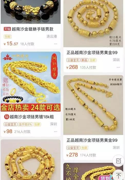 而沙金成品首饰的售价在百元,例如某宝一条金项链的售价也就几百块。