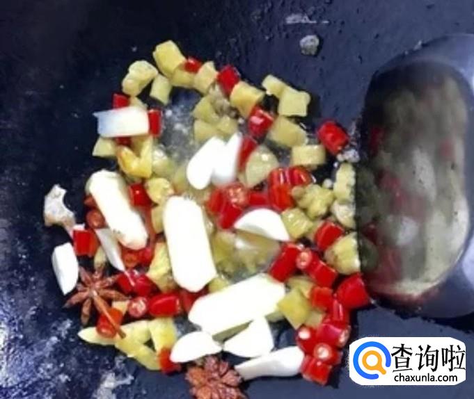 先把油烧辣,然后把佐料倒进去。煸出香味。