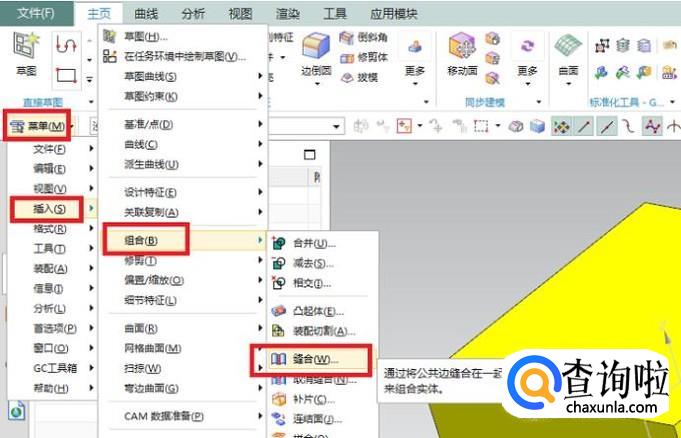 通过第7步的操作,我们明白了封闭的面它还只是个片体,那么怎么将这个片体缝合成实体呢?如下图所示,执行【菜单】【插入】【组合】【缝合】,激活“缝合”命令。