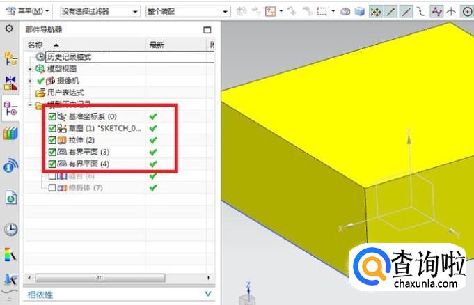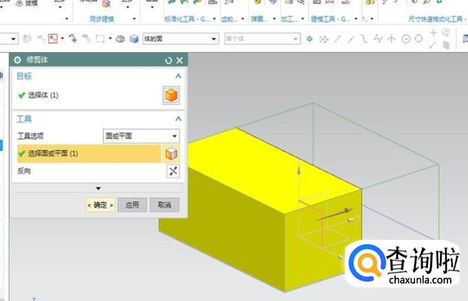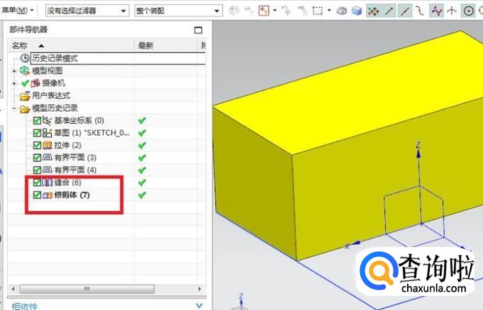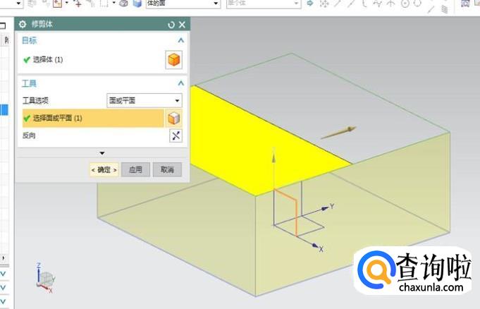 完成了第12步,其实就已经将片体缝合成了实体,如果不信的话,我们再用修剪体来试试看。如下两幅图,第一幅图,选择体的时候,不再是选择单个平面了,而是整个立方体,第二幅图,以XZ面为工具平面修剪完之后,里面也不是空的,而是实心的。所以很明显,我们成功的将三个封闭的片体缝合成了一个实体。