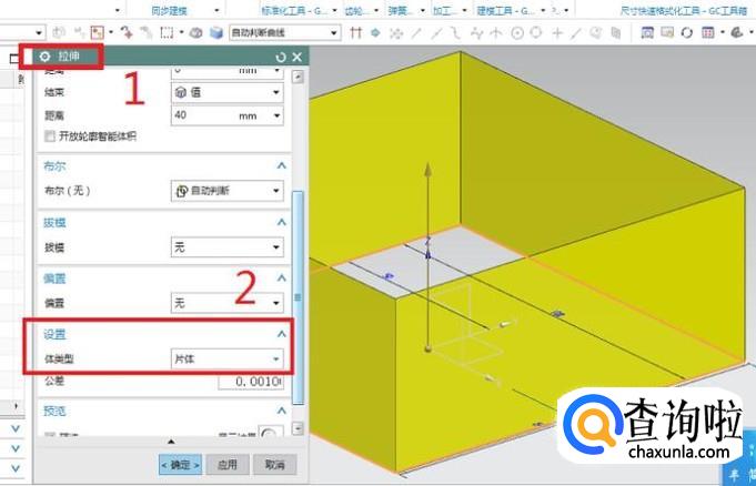 激活拉伸命令(无论是执行【菜单】【插入】【设计特征】【拉伸】也好,还是直接点击工具栏中的“拉伸”快捷图标也好,都行),会弹出如下图所示的“拉伸”对话框,截面曲线、矢量方向、拉伸距离以及布尔等等参数都可以采取默认,关键是如下图所示的2号红色框选,将体类型由默认的实体改为片体。