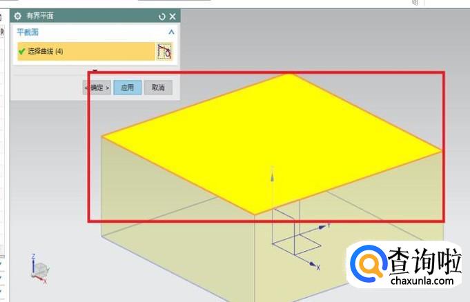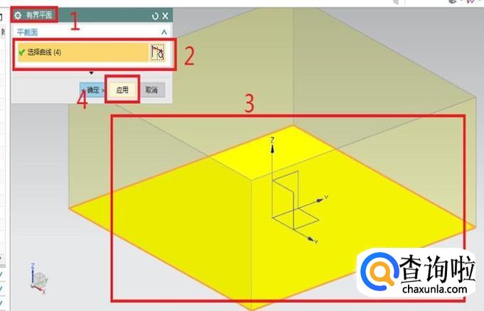 上一步激活“有界平面”之后,会出现如下图所示的“有界平面”对话框(1号红色框选),注意看对话框中的信息,这里主要就一个操作:选择曲线(2号红色框选)。注意看下图中的3号红色框选,这是选择完四条形成封闭的曲线之后自动出现的平面,选择完曲线之后,就可以点击4号红色框选中的“应用”按钮。(为什么不是点击确定呢?应为后面我们还需要用到这个“有界平面”,所以暂时保留这个对话框,只需要点击应用就可以了)