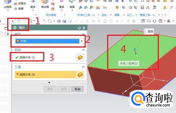 激活“缝合”命令之后,弹出如下图所示的“缝合”对话框(1号红色框选),类型必须选择“片体”(2号红色框选),一般这个是默认的片体,也不需要我们去多此一举的设置。注意3号红色框选,选择目标片体,再看4号红色框选,这个颜色变成绿色的平面就是我们选择的片体。