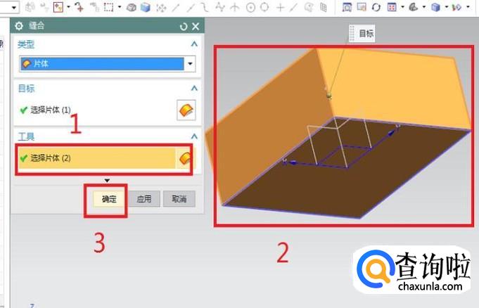 上一步对话框中的目标片体已经选择完了,这一步就只需要选择工具片体了。如下图所示,2号红色框选,除目标片体之外的其余所有片体都需要选中,作为工具片体。然后点击3号红色框选中的“确定”按钮,完成缝合。