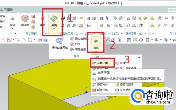 激活“有界平面”命令。具体激活方式可以如下图所示的工具栏中红色框选曲面-更多-有界平面,也可以执行【菜单】【插入】【曲面】【有界平面】,两种方法都行。